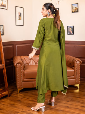 Infuse a rich traditional charm into your ethnic wardrobe with the Shailaja Mehndi Anarkali Kurta Set from VREDEVOGEL. This ready-to-wear ensemble is meticulously crafted from premium silk blend fabric, offering a smooth texture and an elegant shine that ensures you stand out at every celebration. The beautifully flared Anarkali design is accented with delicate embroidery and a stylish fancy neckline, paired perfectly with a lace-bordered dupatta for a look of pure festive grace.