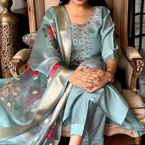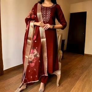Experience the perfect harmony of luxury and comfort with this Cotton Magic 3-Piece Kurta Set. Crafted from premium "Cotton Magic" fabric, the straight-cut kurta features intricate yoke embroidery with delicate sequin-like accents. The set is elegantly elevated by a sheer Chanderi dupatta adorned with vibrant digital floral prints and a contrasting Zari border, making it an ideal choice for festive celebrations and sophisticated ethnic looks.