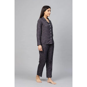 Generic Women's Casual Full Sleeves Polka Dot Printed Rayon Shirt With Pyjama Pant Night Suit Set (Grey)